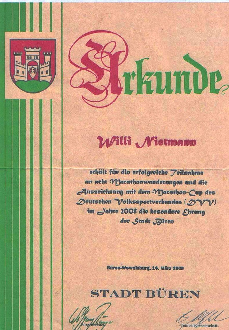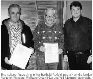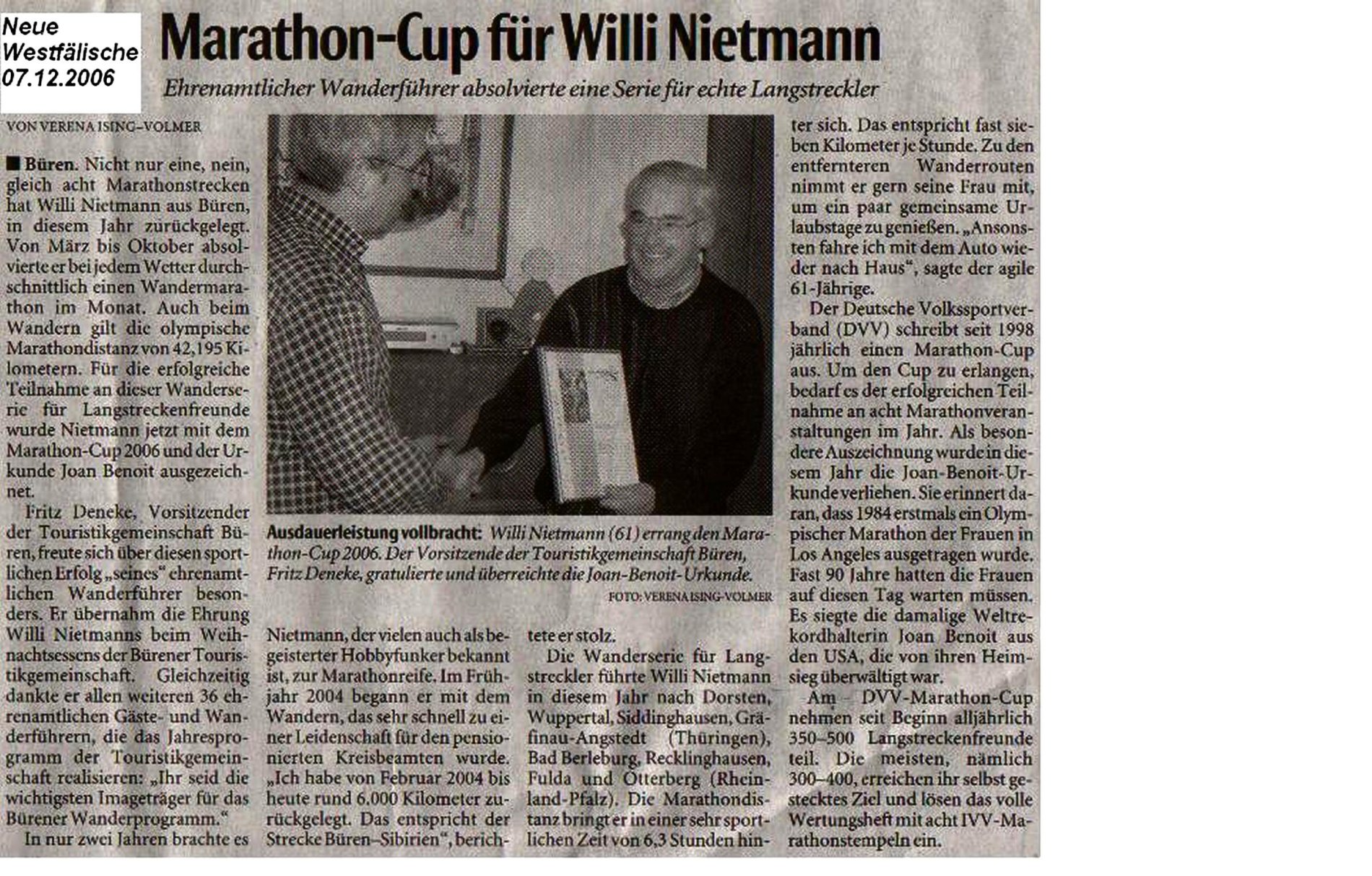 | 2009 | 03.12.2009 | Präsident Willi Nietmann wird anlässlich der Jahresversammlung der Bürener Touristikgemeinschaft für acht erfolgreiche Marathonwanderungen ausgezeichnet | |